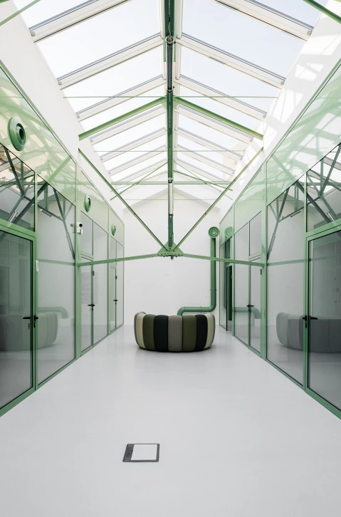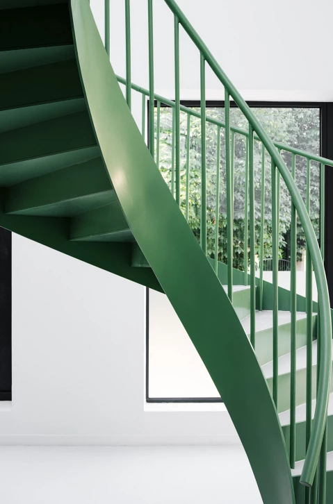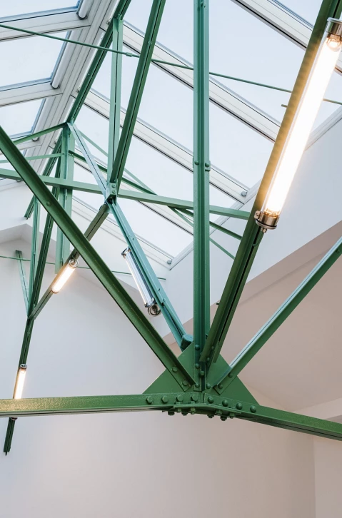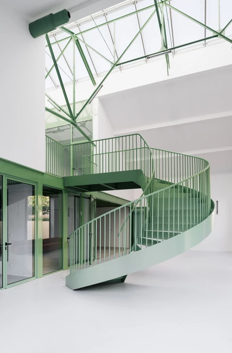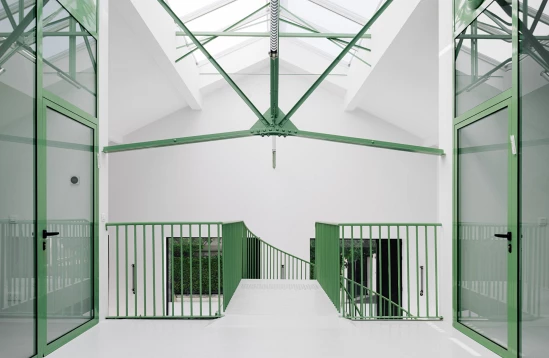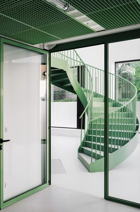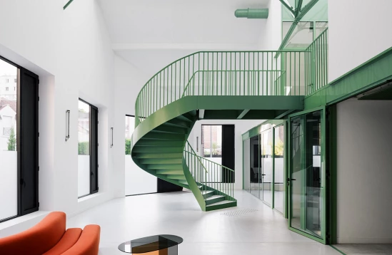 L’intervention fait le choix de préserver l’enveloppe du bâtiment tout en redessinant et élargissant les ouvertures existantes. Des baies en clair de vitrage rythment les façades et la verrière zénithale en toiture. A l’intérieur, un exosquelette métallique indépendant de la structure existante porte le nouveau plancher autour duquel s’articule les bureaux individuels. Un espace en double hauteur accueille un escalier monumental, sans structure porteuse apparente, qui semble léviter dans les airs.