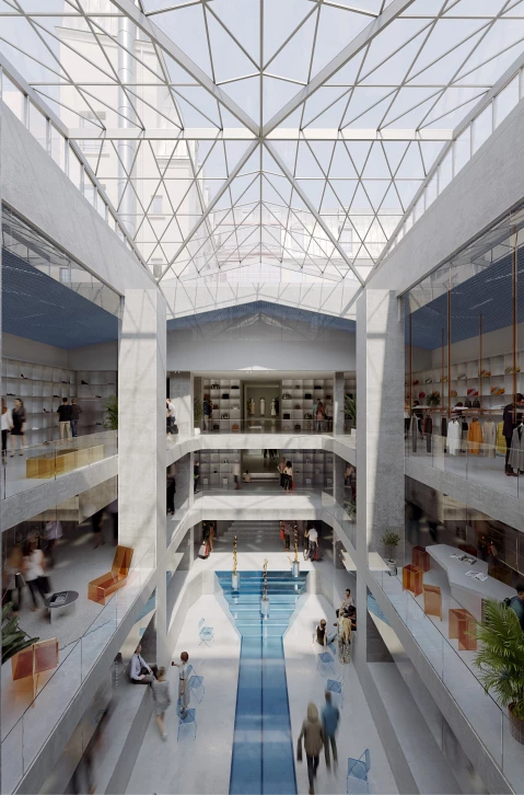 Au 188 rue de Rivoli, un ancien local aveugle est ouvert à la lumière du jour par l’ajout d’une verrière sculpturale en toiture. Cette intervention, à la géométrie affirmée, prend place au cœur d’un îlot historique construit par les architectes Percier et Fontaine. Sa forme entre en résonance avec le site, en écho lointain à la pyramide du Louvre voisine. A l’intérieur, le local est transformé : ses plateaux sont reconfigurés afin de créer une triple hauteur majestueuse sous la verrière créée.