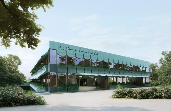 L’école Samaa se situe à Bouskoura, une ville proche de Casablanca, également appelée « ville verte » : une cité démonstratrice des enjeux environnementaux, modèle des bonnes pratiques du développement durable. C’est l’occasion rêvée pour dessiner un projet ambitieux, a fortiori pour un programme destiné à la transmission et à l’éducation. Le bâtiment est composé de béton végétal poreux, au sein duquel les micro-organismes peuvent se développer et prospérer, fabriquant une image changeante : les aspérités créent une enveloppe « vivante » habitée par différents écosystèmes. Les blocs de béton préfabriqué forment une façade organique à l’aspect sculptural, en référence à l’architecture brutaliste de Casablanca. Le bâtiment se présente finalement comme un dispositif pédagogique pour les élèves, invités à prendre conscience des vertus du développement durable. L’ensemble des dispositifs constituent un environnement fertile pour les jeunes usagers : l’école se veut à la fois maison, ville et paysage.